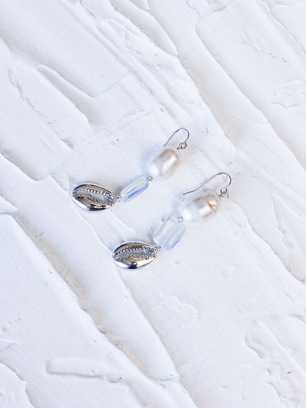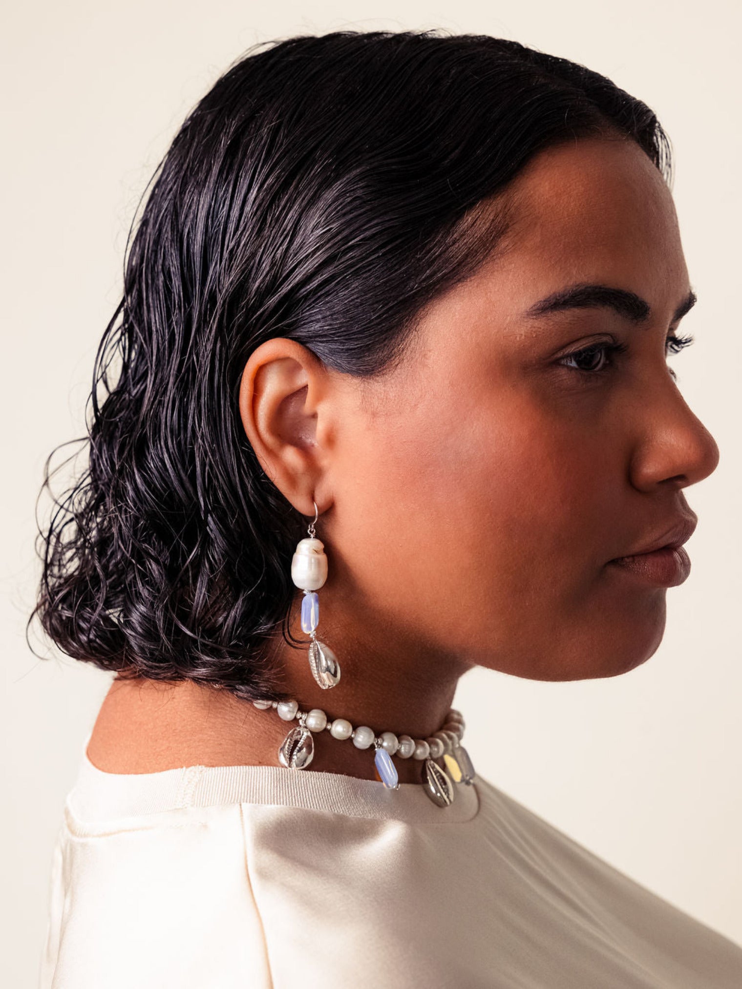 Delicate and lightweight, yet emboldened with divine energy, the River Drop Earrings feature a striking contrast of shapes and materials, from potato pearls to beaded opalite. Matching earrings and necklace are available to create a complete set.